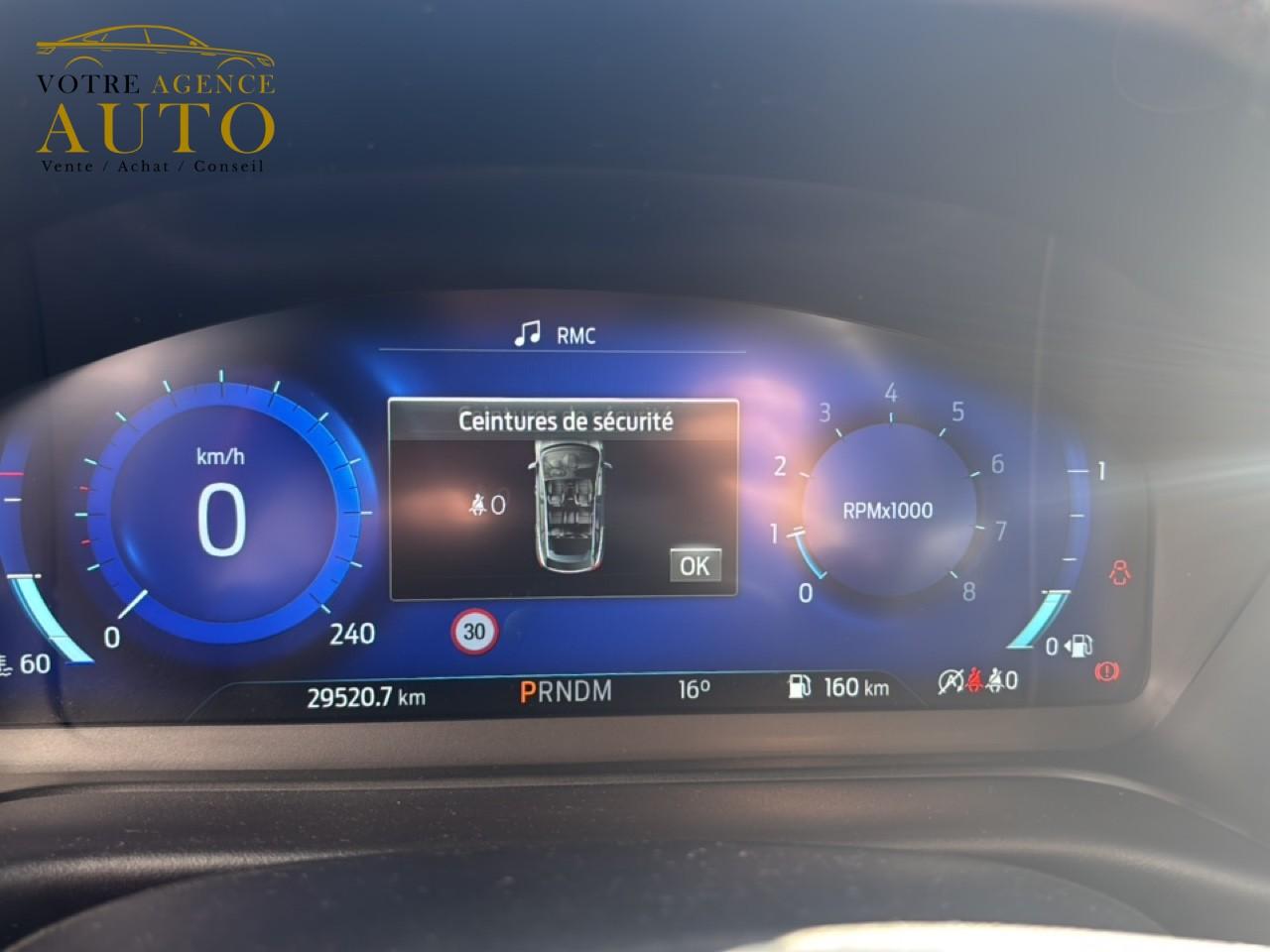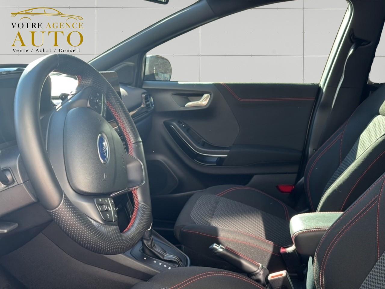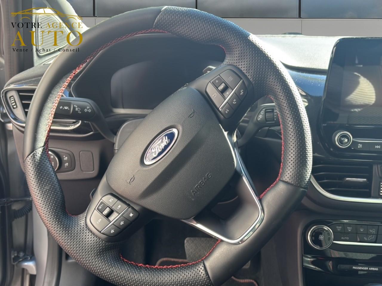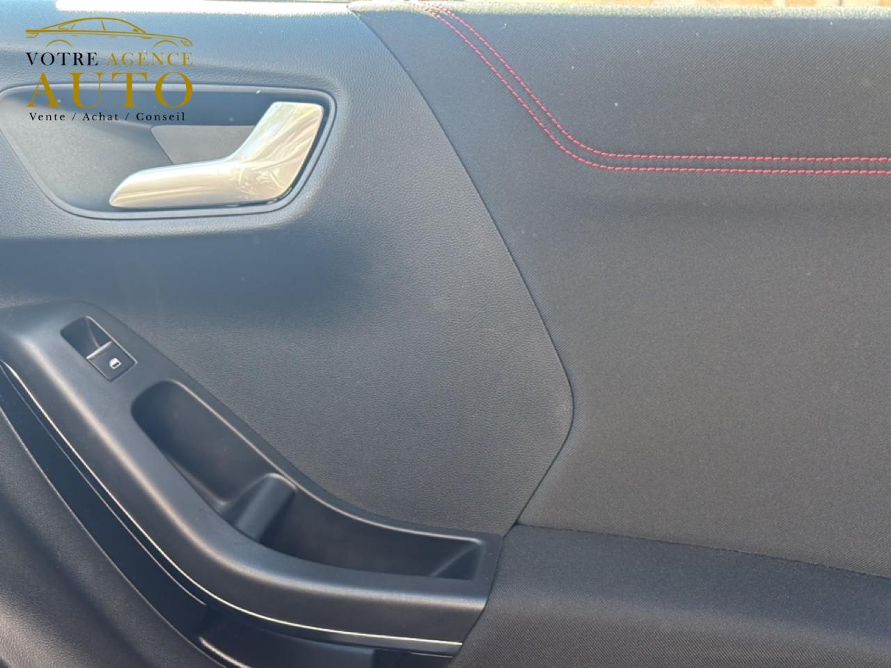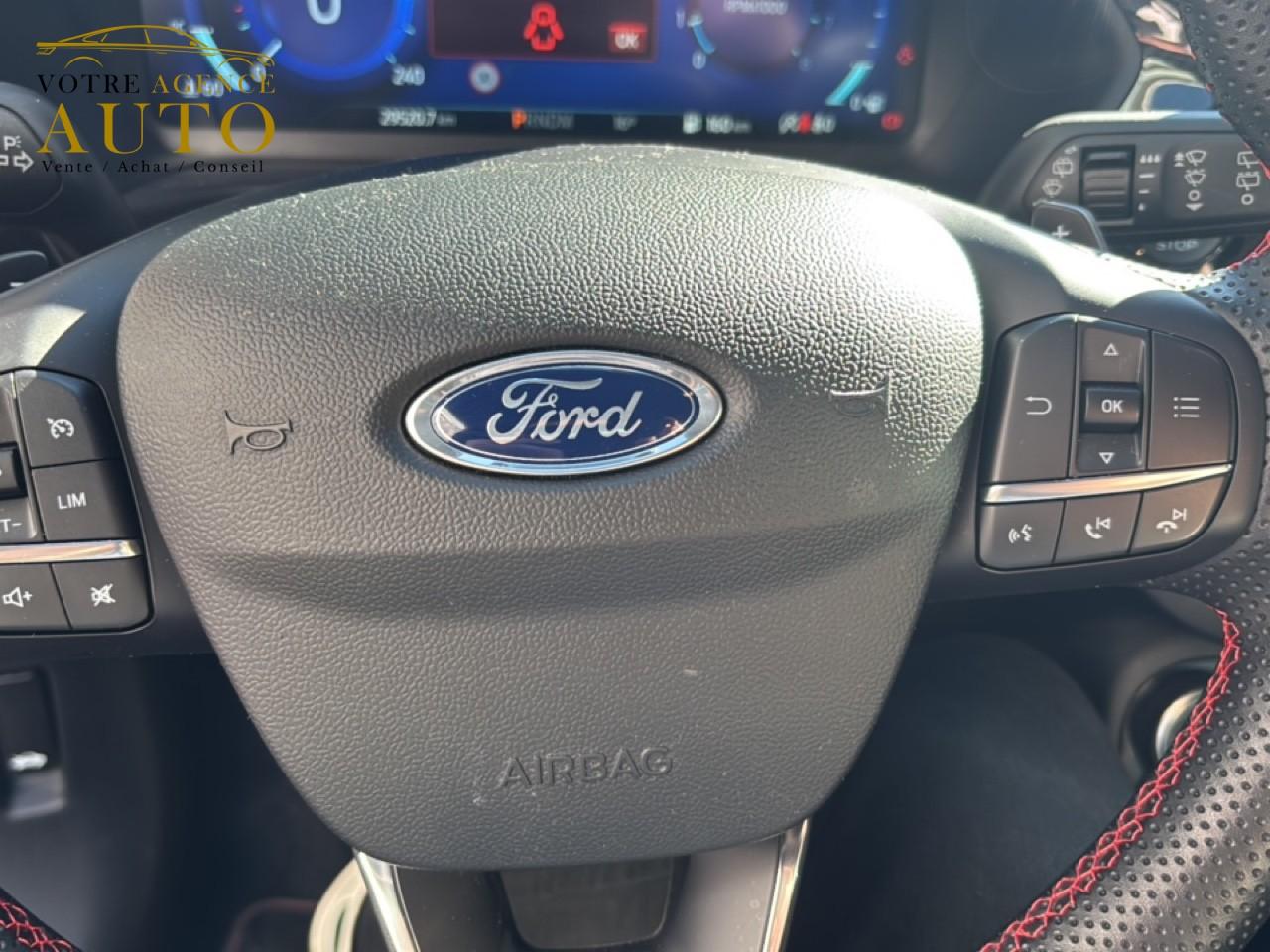 2 Fixations Isofix à l'arrière3 appuie-tête arrière5 ceintures de sécurité 3 points5 Modes de conduite sélectionnables (normal, eco, sport, faible adhérence, trail)Aide au démarrage en côteAide au maintien dans la voie avec détection des bas-côtésAide au stationnement arrièreAirbags frontaux, latéraux (thorax) et rideauxAlerte d'oubli de ceintures avant/arrièreAlerte de franchissement Involontaire de ligneAllumage automatique des projecteursAntipatinageAppuie-tête arrière réglables en hauteurAssistance au freinage d'urgenceAvertisseur de freinage d'urgenceBadges ST-LineBanquette arrière rabattable 40/60Bas de caisse couleur carrosserieBecquet arrière couleur carrosserieBouton de démarrage "Ford Power"Combiné d'instrumentation numérique 12,3" avec EcomodeConsole centrale avant avec deux porte-gobelets rétroéclairésConsole centrale avec accoudoir et rangementsContour des vitres latérales en noir finition brillanteCorrecteur électronique de trajectoire ESPDésactivation de l'airbag du passager avantDirection assistée électriqueEclairage d'ambiance intérieurFeux arrière à LEDFeux de jour à LEDFeux de route intelligents (passage feux de croisement/route automatique)FordPass Connect avec modem embarqué et fonction eCallFrein à disques à l'avantGrille de calandre ST-LineJantes alliage 18" 5x2 branches finition Black MattKit carrosserie ST-LineKit de réparation pneumatiqueLevier de frein à main gainé de SensicoLevier de vitesses gainé de SensicoLimiteur de vitesse intelligentLogo MHEV sur HayonPack ConfortPalettes au volantPare-chocs couleur carrosseriePédalier designPeinture non-métallisée Bleu AbyssePhares avant antibrouillard avec fonction d'éclairage d'anglePrise 12 V sur console centrale avantRégulateur de vitesseRétroviseur intérieur électrochromeRétroviseurs extérieurs électriques couleur carrosserie, dégivrant et rabattables avec rappels de clignotantsSellerie Mixte noire tissu Sensico Tire on Casual et Sensico SalernoSiège conducteur réglable en hauteur avec soutien lombairesSiège passager réglable en hauteur avec soutien lombaireSortie d'échappement chroméeSuspensions sportSystème audio B&O avec SYNC3 avec écran tactile 8", commandes vocales, 2 ports USB, Apple CarPlay et Android auto, 10 haut-parleursSystème de freinage antiblocage (ABS)Système de Navigation Europe et points d'intérêt MichelinSystème de prévention de collision avec freinage post-collision et détection piétonsSystème de surveillance de pression des pneusSystème MyKey (seconde clé programmable)Système Stop & StartTapis de sol avant avec surpiquresTrappe à carburant Ford EasyFuelVerrouillage centralisé à distanceVitres arrière surteintéesVitres électriques avant et arrière avec descente et remontée à impulsionVolant à méplat 3 branches ST-Line avec surpiqûres rouges