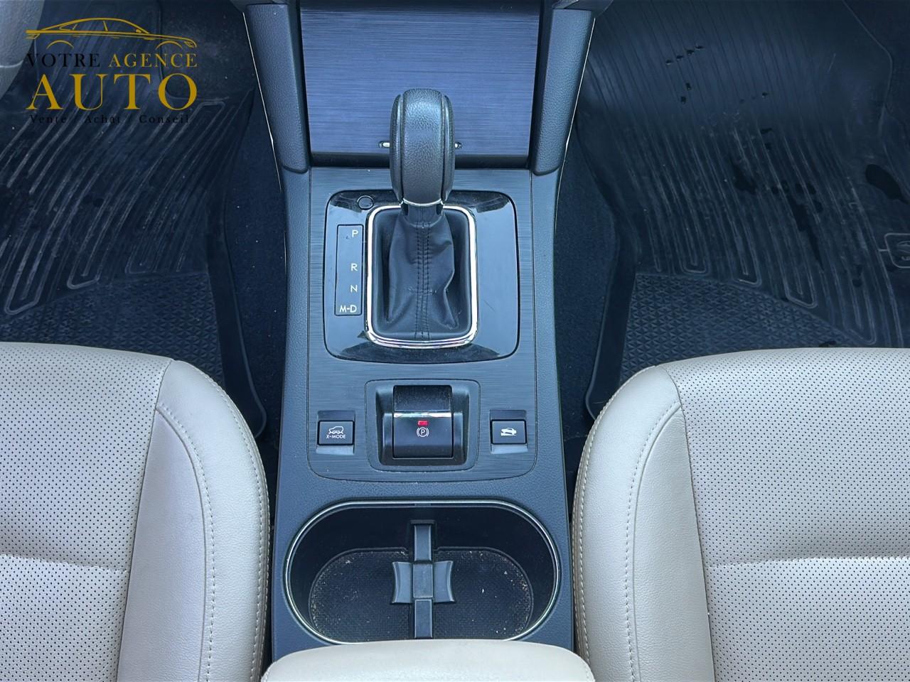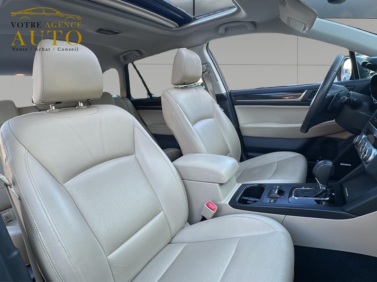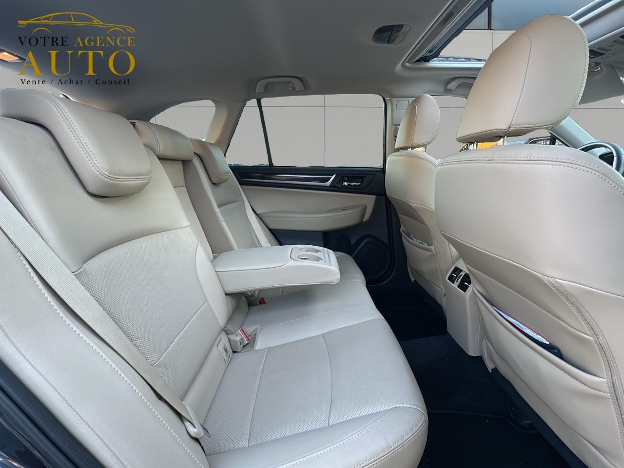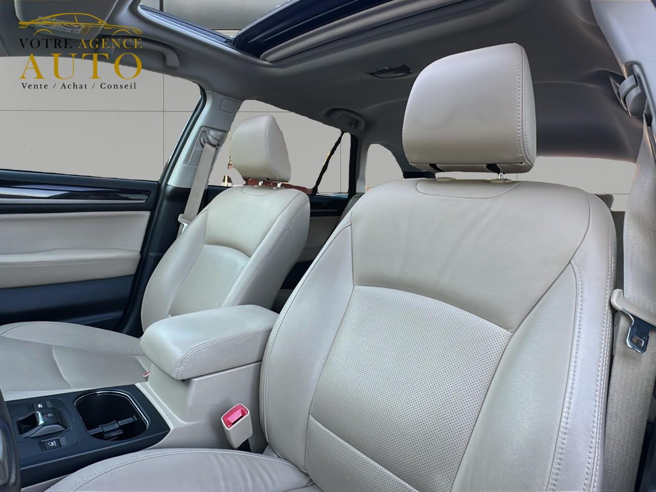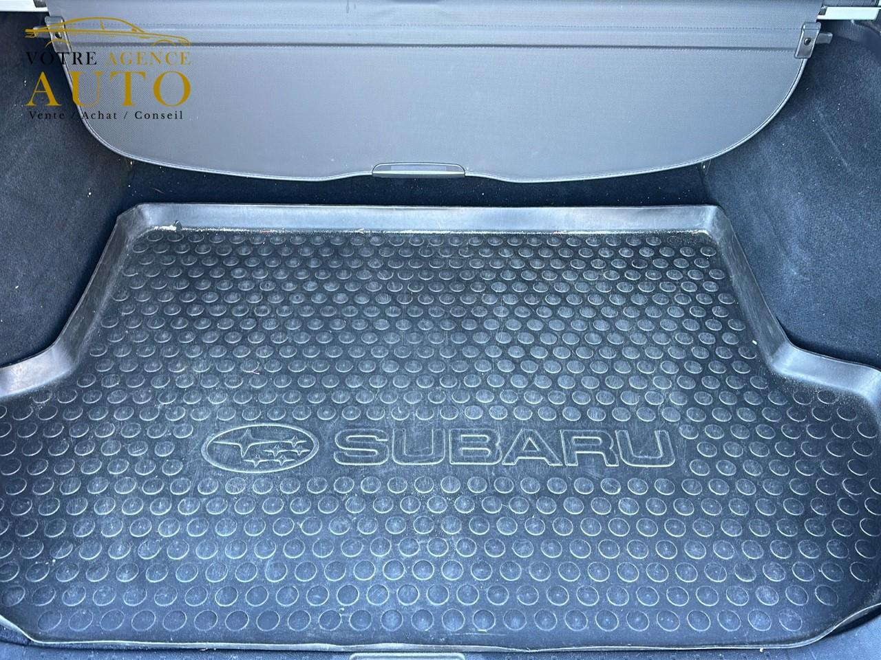 2 crochets à bagages2 prises USB et prise Aux-In4 crochets d'arrimageABS 4 capteurs / 4 canaux avec répartiteur électronique de la force de freinageAccès par code PINAccoudoir central arrièreAide au démarrage en côteAirbags de genoux SRSAirbags frontaux SRSAirbags latéraux SRS (pour sièges avant)Airbags rideaux SRS (avant et arrière, des 2 côtés)Allumage automatique des projecteursApplication SiriAssistance au freinage d'urgenceAumônières au dos des sièges avantAuto start stopBarres de toit couleur ArgentBecquet de toitBouches de chauffage pour les passagers arrièreCache bagages rétractableCaméra de reculCasier de console centraleCeinture avec alarme (pour chaque siège)Ceintures de sécurité arrière 3 pointsCeintures de sécurité avant à prétensionneurs et limiteurs de chargeClignotant à commande séquentielleClimatisation automatique double zone avec filtre anti-poussièreCommandes de l'autoradio au volantCompartiment de rangement sous le plancher de coffreContrôle de tractionDégivrage avant et latéralDégivrage électrique de la lunette arrière avec temporisateurEclairage d'accueilEclairage de coffreEclairage habitacle avec lampes de lectureEcran couleur LCD 5" avec affichage du système Eyesight et jauges électro-luminescentesEssuie-glace à déclenchement automatiqueEssuie-glace arrière à balayage intermittentEssuie-glace avant dégivrantEyeSightFermeture centralisée des portes à distanceFeu arrière antibrouillardFrein de stationnement électroniqueHayon à commande électriqueImmobiliseur moteur (coupe-circuit)Jantes alliage 17''Jauge EcoKit anti-crevaisonLave-pharesMiroirs de courtoisie éclairés avec couvercle (sièges avant)Ouverture intérieure de la trappe à carburantPalette de sélection au volantPare-brise et vitres latérales avant et arrière avec protection UVPédales de sécuritéPlateau centralPochettes latérales avec porte-bouteilles (sur chaque porte)Porte-gobelets arrière (dans l'accoudoir central arrière)Porte-gobelets avantPrise d'alimentation 12 V (dans la console centrale)Projecteurs antibrouillardProjecteurs LED avec correction d'assiette automatiqueReconnaissance vocaleRéglage en hauteur des ceintures de sécurité avantRégulateur de vitesseRétroviseurs électriques rabattables avec clignotants à LED intégrésRétroviseurs extérieurs chauffantsRevêtement de protections latéralesSécurité enfant sur les portes arrièresSI-DRIVE (SUBARU Intelligent Drive)Siège conducteur à réglages électriques 8 directionsSiège conducteur avec fonction mémoireSiège passager à réglage électrique 8 positionsSièges arrière rabattables et repliables 60/40Sièges arrière repliables sur simple pressionSièges avant chauffantsSièges en cuirSystème d'ancrage ISO-FIX pour siège enfantSystème d'entrée sans clé avec démarrage par bouton-poussoirSystème d'infodivertissement SUBARU STARLINK avec navigation à carte SD et système audio : 1 CD + 6 HPSystème de contrôle de la dynamique du véhicule avec bouton OFFSystème de contrôle en descenteSystème de freinage prioritaireSystème de ventilation ARSystème mains-libres compatible BluetoothTémoin d'alerte du niveau de l'huile moteurToit ouvrant électrique coulissant et inclinableTransfert de couple vectoriel actifVitres arrière, vitres de custode et lunette arrière teintéesVitres avant et arrière électriques à impulsion avec système ant-ipincementVolant gainé cuirVolant réglable en hauteur et inclinaisonX-MODE
