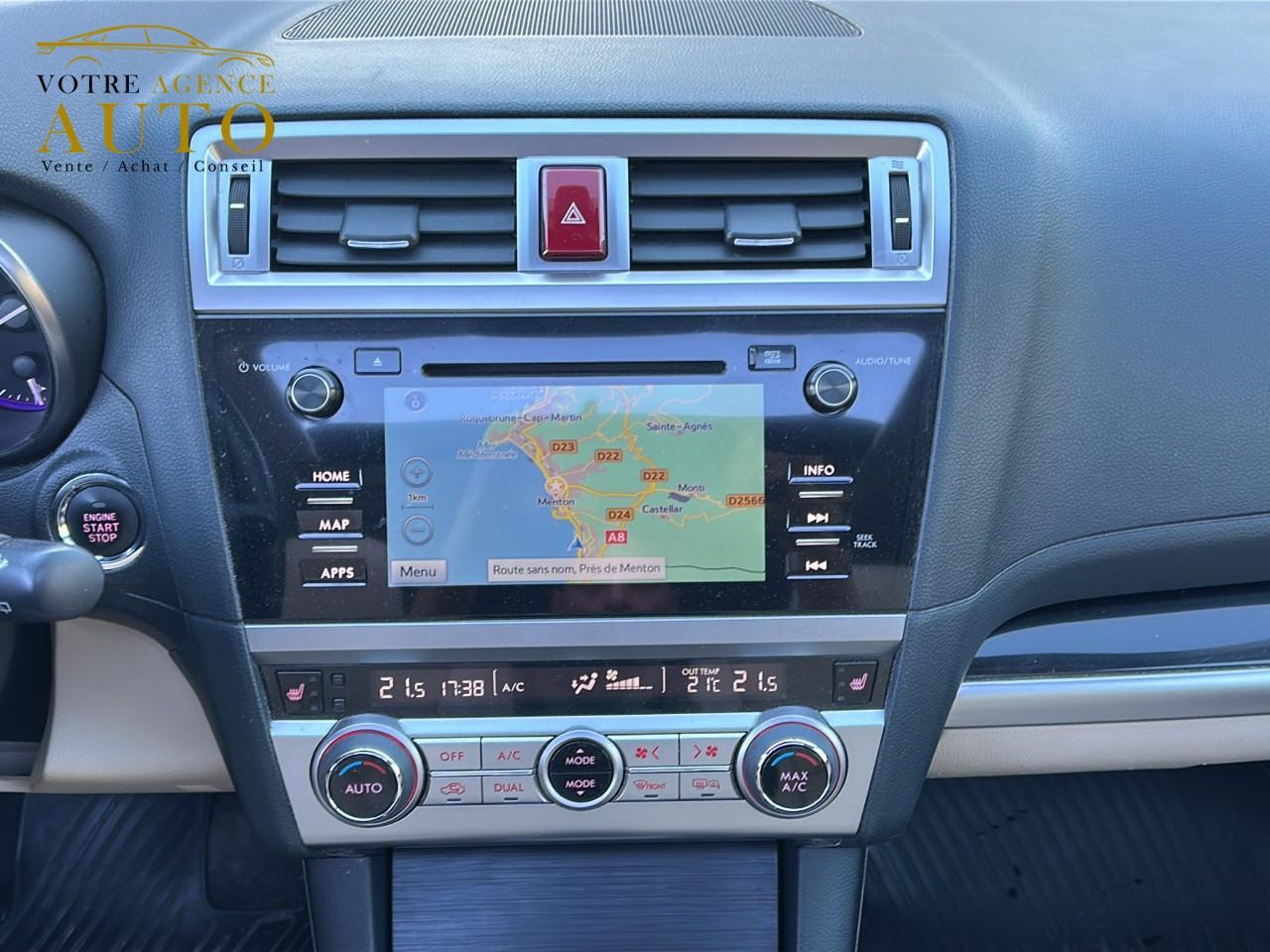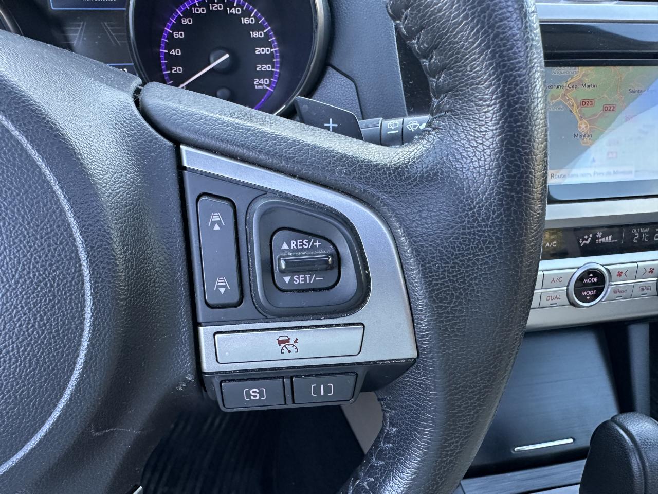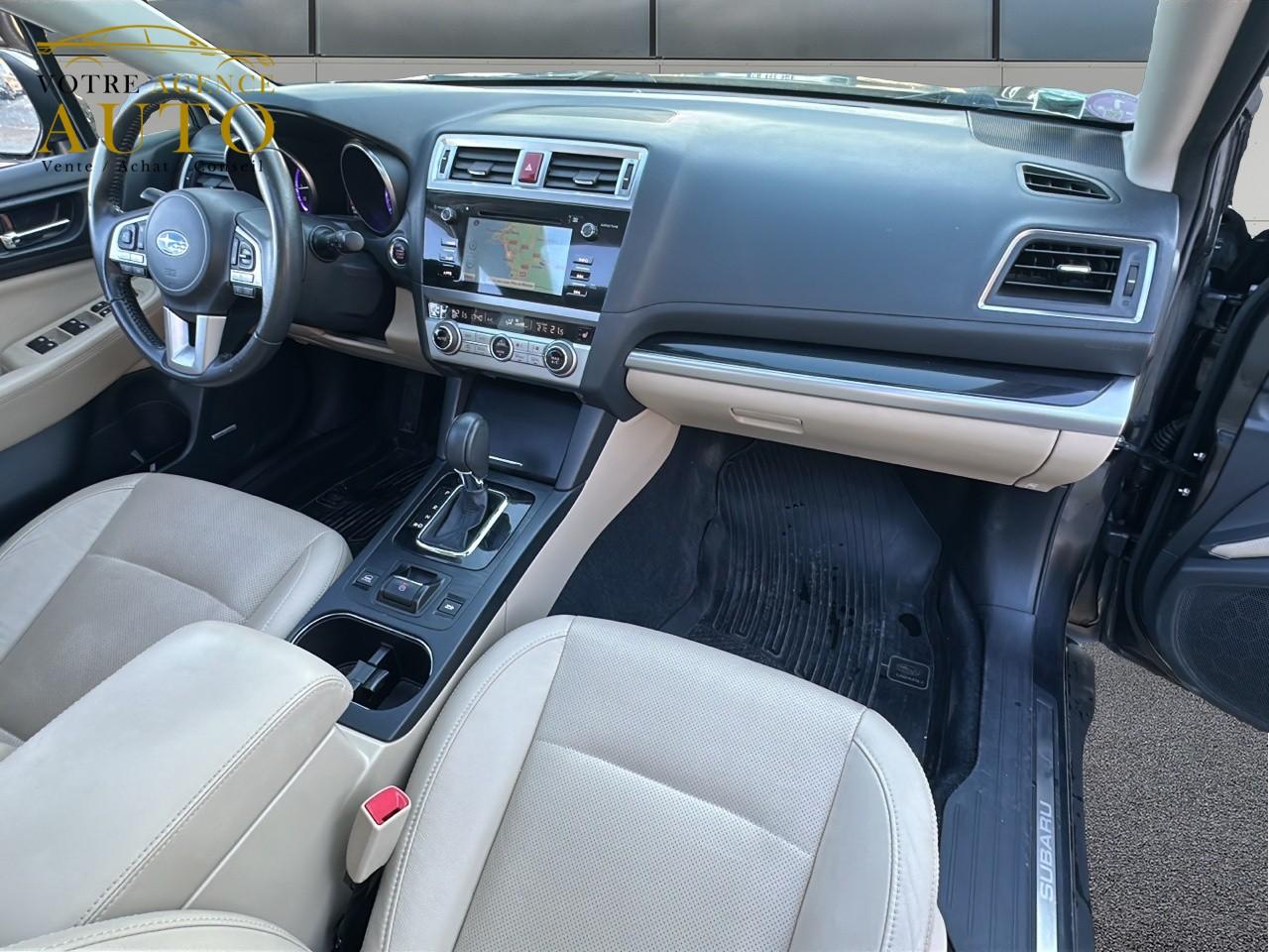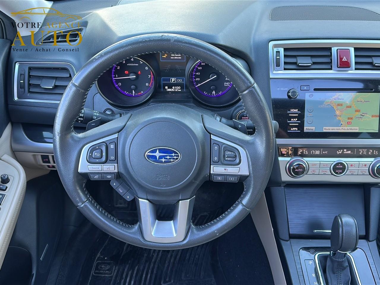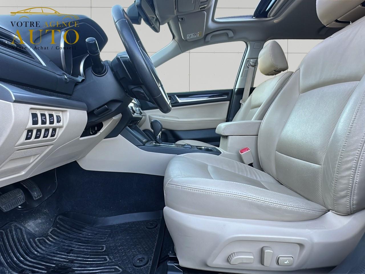 2 crochets à bagages2 prises USB et prise Aux-In4 crochets d'arrimageABS 4 capteurs / 4 canaux avec répartiteur électronique de la force de freinageAccès par code PINAccoudoir central arrièreAide au démarrage en côteAirbags de genoux SRSAirbags frontaux SRSAirbags latéraux SRS (pour sièges avant)Airbags rideaux SRS (avant et arrière, des 2 côtés)Allumage automatique des projecteursApplication SiriAssistance au freinage d'urgenceAumônières au dos des sièges avantAuto start stopBarres de toit couleur ArgentBecquet de toitBouches de chauffage pour les passagers arrièreCache bagages rétractableCaméra de reculCasier de console centraleCeinture avec alarme (pour chaque siège)Ceintures de sécurité arrière 3 pointsCeintures de sécurité avant à prétensionneurs et limiteurs de chargeClignotant à commande séquentielleClimatisation automatique double zone avec filtre anti-poussièreCommandes de l'autoradio au volantCompartiment de rangement sous le plancher de coffreContrôle de tractionDégivrage avant et latéralDégivrage électrique de la lunette arrière avec temporisateurEclairage d'accueilEclairage de coffreEclairage habitacle avec lampes de lectureEcran couleur LCD 5" avec affichage du système Eyesight et jauges électro-luminescentesEssuie-glace à déclenchement automatiqueEssuie-glace arrière à balayage intermittentEssuie-glace avant dégivrantEyeSightFermeture centralisée des portes à distanceFeu arrière antibrouillardFrein de stationnement électroniqueHayon à commande électriqueImmobiliseur moteur (coupe-circuit)Jantes alliage 17''Jauge EcoKit anti-crevaisonLave-pharesMiroirs de courtoisie éclairés avec couvercle (sièges avant)Ouverture intérieure de la trappe à carburantPalette de sélection au volantPare-brise et vitres latérales avant et arrière avec protection UVPédales de sécuritéPlateau centralPochettes latérales avec porte-bouteilles (sur chaque porte)Porte-gobelets arrière (dans l'accoudoir central arrière)Porte-gobelets avantPrise d'alimentation 12 V (dans la console centrale)Projecteurs antibrouillardProjecteurs LED avec correction d'assiette automatiqueReconnaissance vocaleRéglage en hauteur des ceintures de sécurité avantRégulateur de vitesseRétroviseurs électriques rabattables avec clignotants à LED intégrésRétroviseurs extérieurs chauffantsRevêtement de protections latéralesSécurité enfant sur les portes arrièresSI-DRIVE (SUBARU Intelligent Drive)Siège conducteur à réglages électriques 8 directionsSiège conducteur avec fonction mémoireSiège passager à réglage électrique 8 positionsSièges arrière rabattables et repliables 60/40Sièges arrière repliables sur simple pressionSièges avant chauffantsSièges en cuirSystème d'ancrage ISO-FIX pour siège enfantSystème d'entrée sans clé avec démarrage par bouton-poussoirSystème d'infodivertissement SUBARU STARLINK avec navigation à carte SD et système audio : 1 CD + 6 HPSystème de contrôle de la dynamique du véhicule avec bouton OFFSystème de contrôle en descenteSystème de freinage prioritaireSystème de ventilation ARSystème mains-libres compatible BluetoothTémoin d'alerte du niveau de l'huile moteurToit ouvrant électrique coulissant et inclinableTransfert de couple vectoriel actifVitres arrière, vitres de custode et lunette arrière teintéesVitres avant et arrière électriques à impulsion avec système ant-ipincementVolant gainé cuirVolant réglable en hauteur et inclinaisonX-MODE